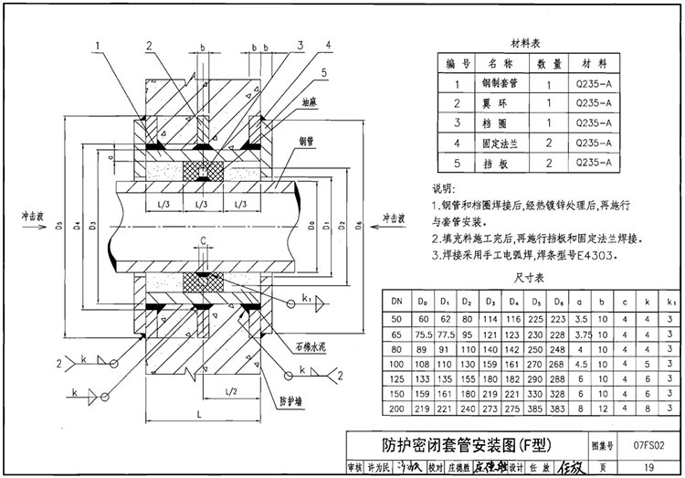 E型;鋼制套管 數(shù)量1材質(zhì)(Q235A)翼環(huán)數(shù)量1 材質(zhì)(Q235A) 固定法蘭 數(shù)量2 材質(zhì)(Q235A 擋板數(shù)量2 材質(zhì)(Q235A)管道和填充材料施工完后,再施行擋板和固定法蘭焊接。