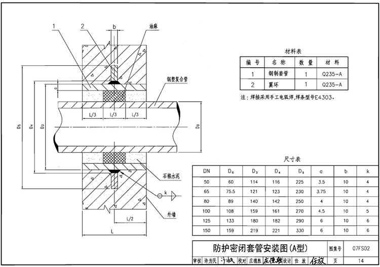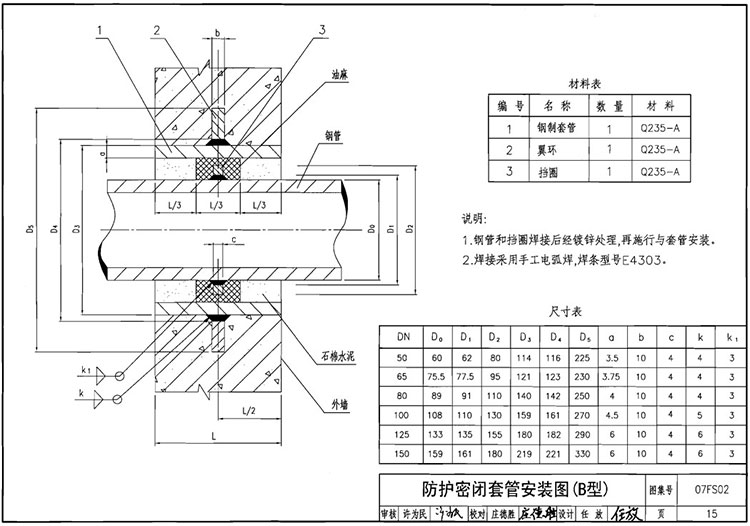 D型;鋼制套管 數(shù)量1材質(zhì)(Q235A)翼環(huán)數(shù)量1 材質(zhì)(Q235A)固定法蘭 數(shù)量1 材質(zhì)(Q235A 擋板數(shù)量1 材質(zhì)(Q235A)擋圈 數(shù)量1 材質(zhì)(Q235A) 說明;鋼管和擋圈焊接后經(jīng)鍍鋅處理,再施行與套管安裝,填充材料施工完后,再施行擋板和固定法蘭焊接。
